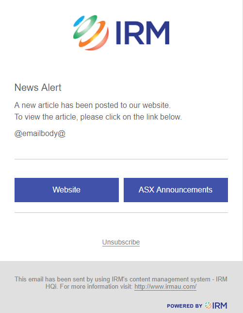 The email alert template is the preset format for emails that will be sent to your subscribers. When setting up your website, IRM will design your email alert templates as required. If you need guidance or would like to make any changes to the look of the templates, please contact your Account Manager. Below is an example of an IRM email alert template.